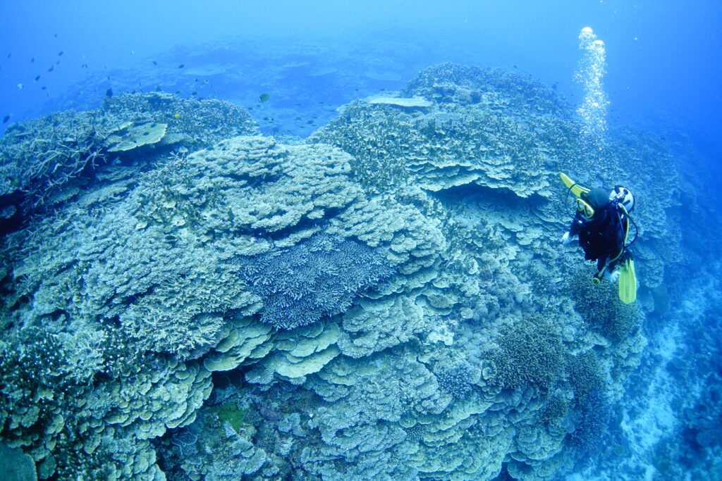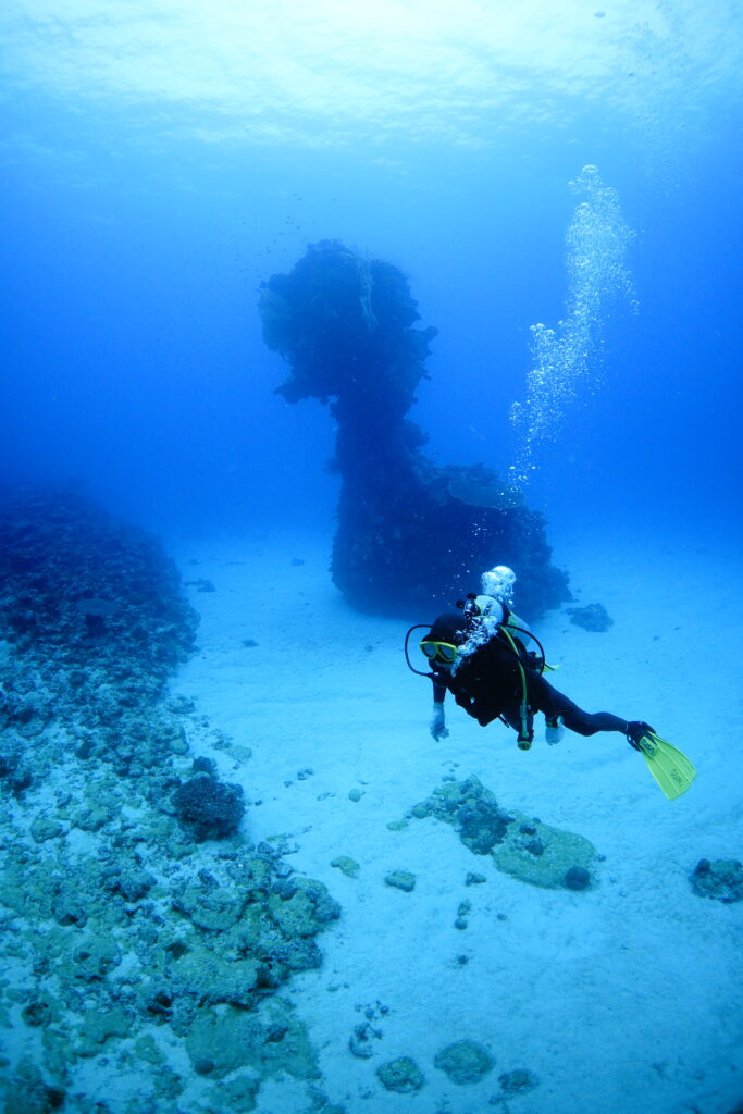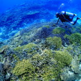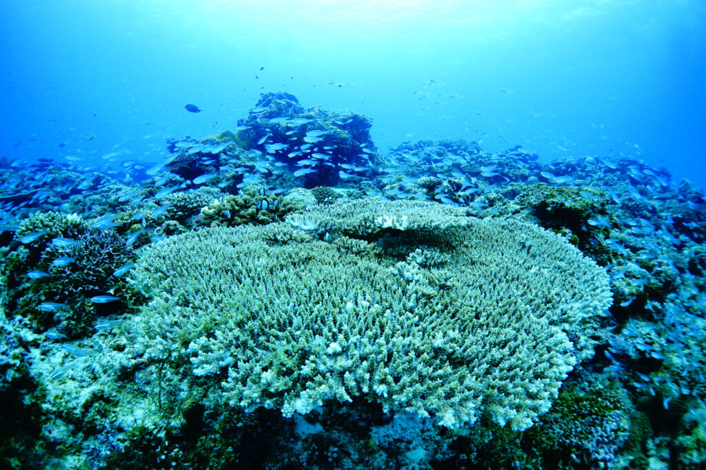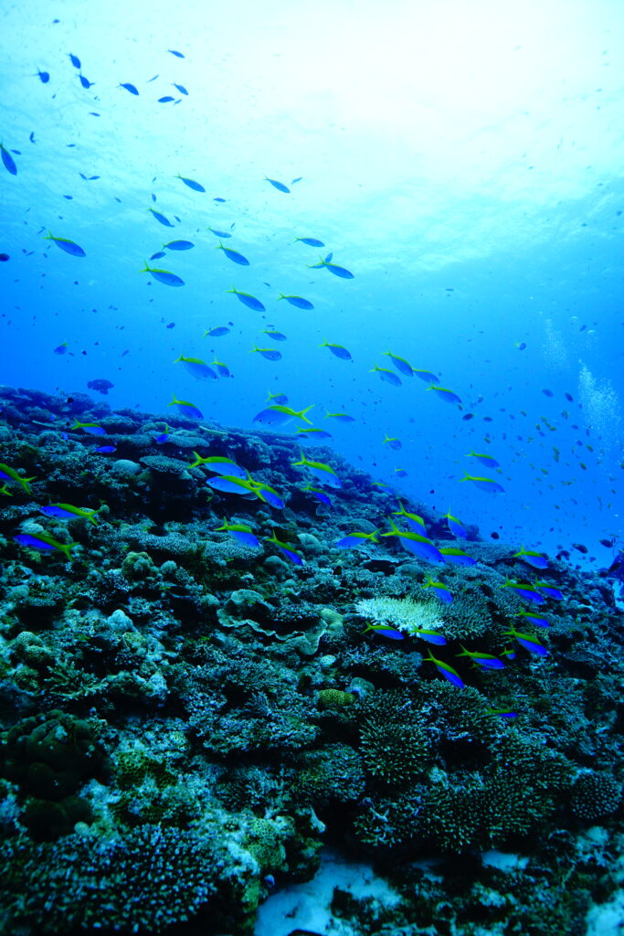 2本目は透明度20mまで回復し、より気持ちよく潜れるコンディション。アヒルの形をした根の頭では、スカシテンジクダイとキンメモドキがびっしり群れ、角度を変えて「この向きだとアヒルに見えますよ」とご案内すると、ゲストも驚きながら楽しんでくれました。さらにパラオハマサンゴの大群生にも感動。15m前後のやや深めでもこれだけ豊かなサンゴが広がる景色は、伊是名ならではの魅力です。