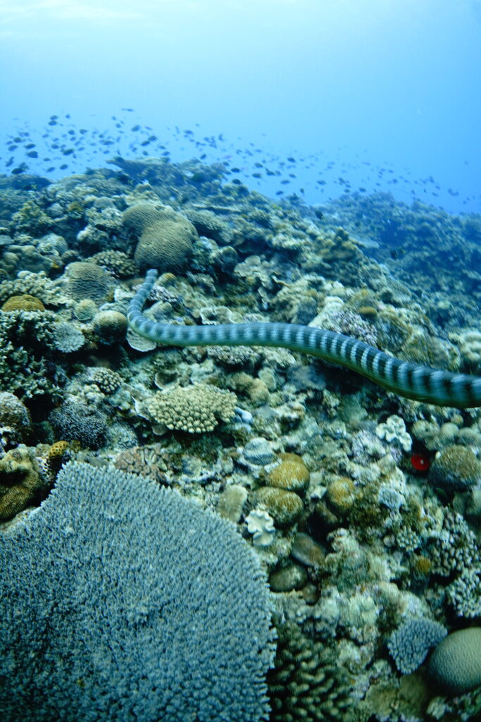 透明度は15mと少し白っぽさはありましたが、水中に入るとハナゴイ、キホシスズメダイ、ウメイロモドキが乱舞していてとても華やか。スズメダイの産卵シーズンらしく、産卵後の弱った個体を狙ってエラブウミヘビが集まる、自然のドラマも観察できました。透明度以上に“生き物の動き”が面白く、ゲストも夢中で見入っていました。