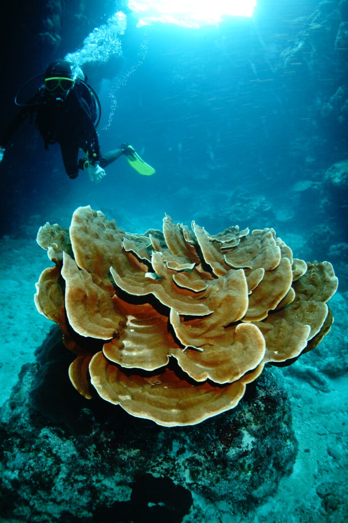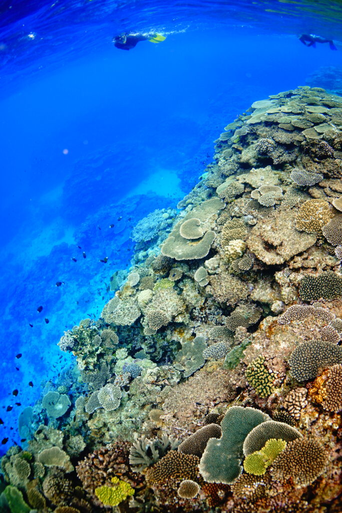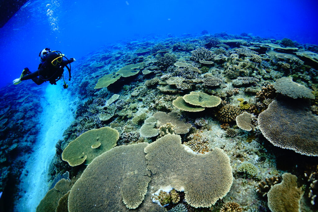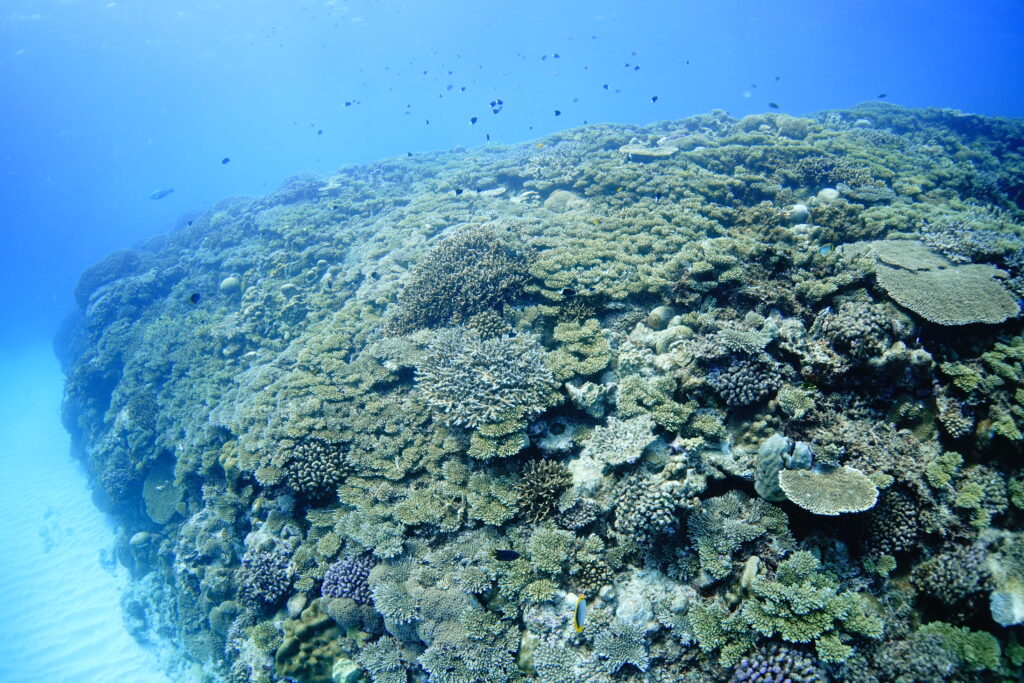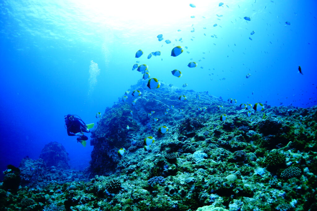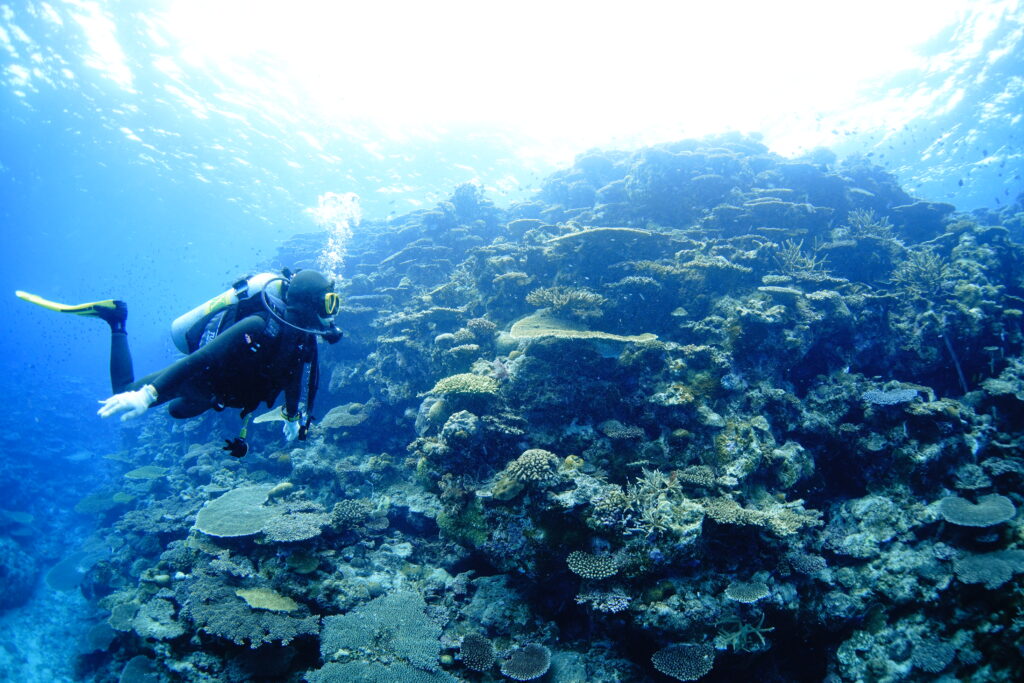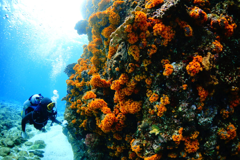 透明度20〜25mと気持ちのいい青さ。エントリーしてすぐ、満開のキサンゴのオレンジがとても鮮やかで、水中が一気に華やかに。浅瀬の色鮮やかなサンゴ礁から、後半は外洋感のあるワイルドな景色へと雰囲気がどんどん変わり、1本の中でいろいろな表情を楽しめました。ハナゴイやカスミチョウチョウウオに包まれ、ラストにはなんとクジラの歌まで聞こえる贅沢な時間。とても充実したスタートになりました。