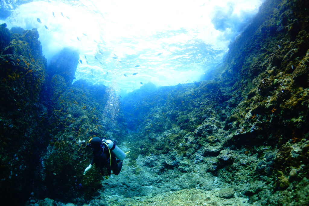ダイバーチームは透明度20m、水温24℃。洞窟へ向かう途中で今シーズン初のコブシメに遭遇し、幸先のいい1本に。曇り空で洞窟内に光は差し込みませんでしたが、そのぶんマクロ探しをじっくり楽しみ、入口のバラの形をしたサンゴのオブジェやソリハシコモンエビ、キサンゴなど細かな見どころをのんびり観察できました。