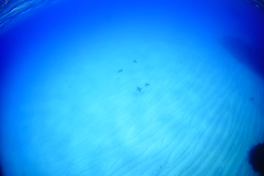 シュノーケルチームは砂地を渡っていると、バラクーダの群れに加えてマダラトビエイの編隊まで登場。さらにお目当てのアオウミガメにも会えて、忙しいほど豪華な1本になりました。