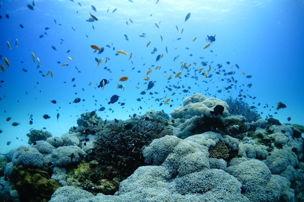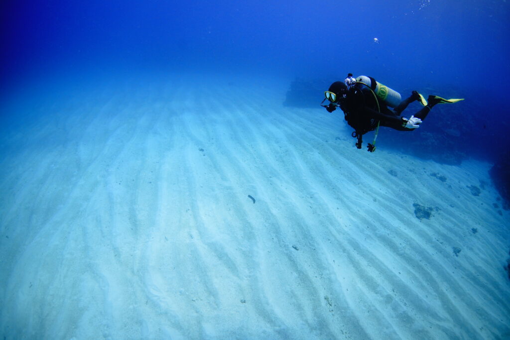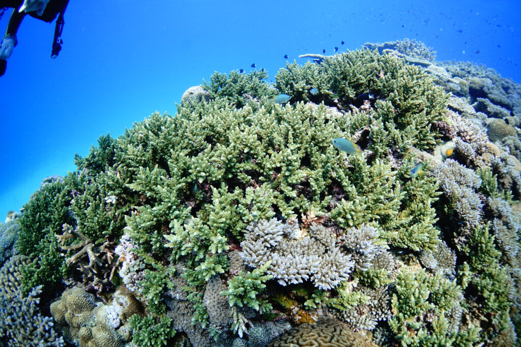 ダイバーチームは透明度15〜20m。船の下は青く抜け、沖は少し濁り気味でしたが、このポイントでは珍しいバラクーダの群れが登場。キンギョハナダイやキホシスズメダイが群れる根、緑色の珍しいサンゴ、そしてラストダイブにふさわしい美しい砂紋と浅瀬のサンゴ礁で締めくくりました。