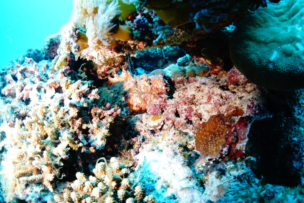 サンゴの下には、ぶさかわなオニダルマオコゼや、珍しいオランウータンクラブも発見。マクロから群れまでバランスよく楽しめる1本でした。