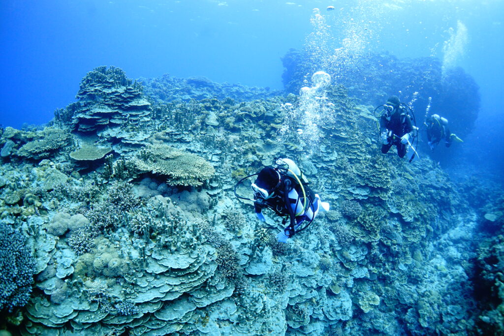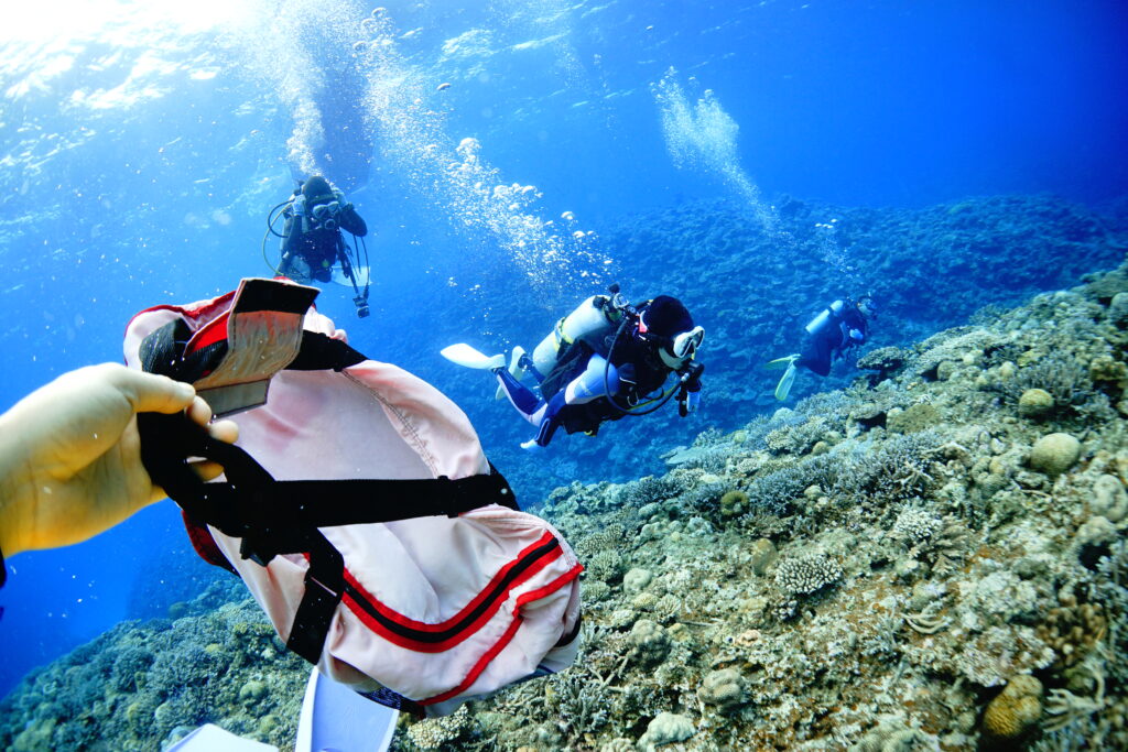 この日はいつもと少し違い、サンゴの保全活動ダイブからスタート。シーブリーズ沖縄のマキさんのお声がけで、リピーターさんも一緒に参加していただきました。