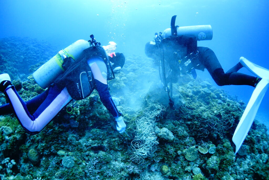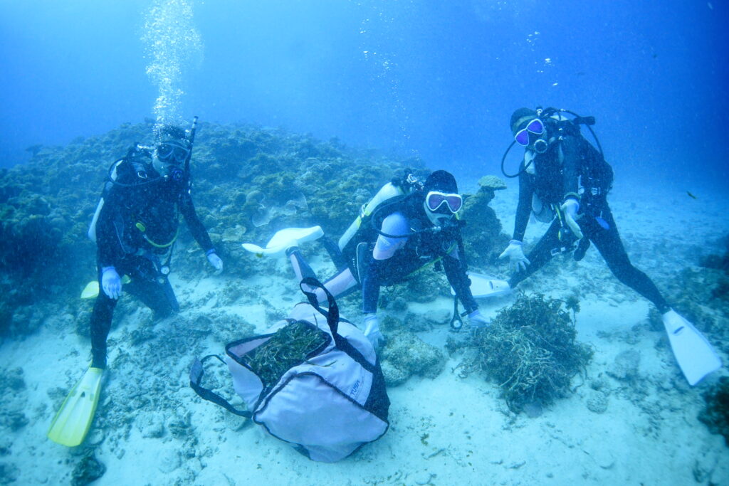 サンゴに絡まった廃漁網をハサミで丁寧に取り除く作業。みんなが集中して取り組んでくれたおかげで、あっという間にメッシュバッグが満タンに。伊是名の大切なサンゴ礁を守る、意味のある1本になりました。ご協力本当にありがとうございました!