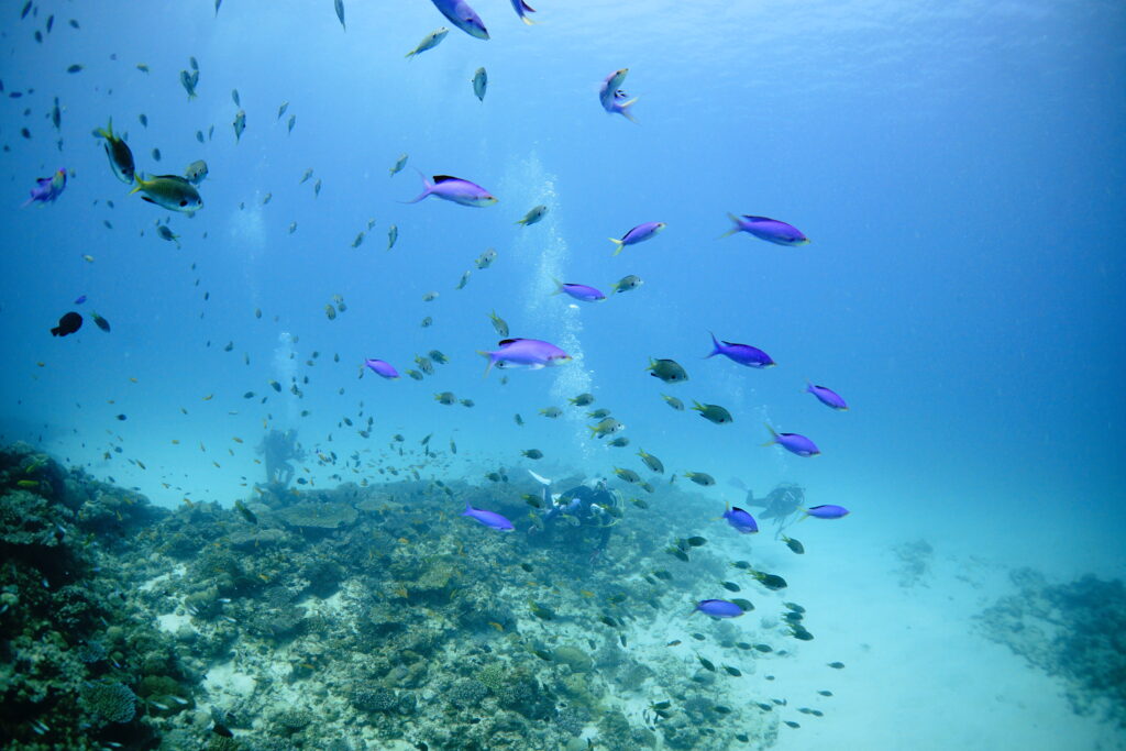 ヨスジフエダイの黄色、ハナゴイの紫、ウメイロモドキのツートンカラーと色のバランスがとても綺麗で、見ているだけで癒される景色でした。クモウツボのちょっとユニークな姿や、かわいいグルクンの幼魚たちも見どころでした。