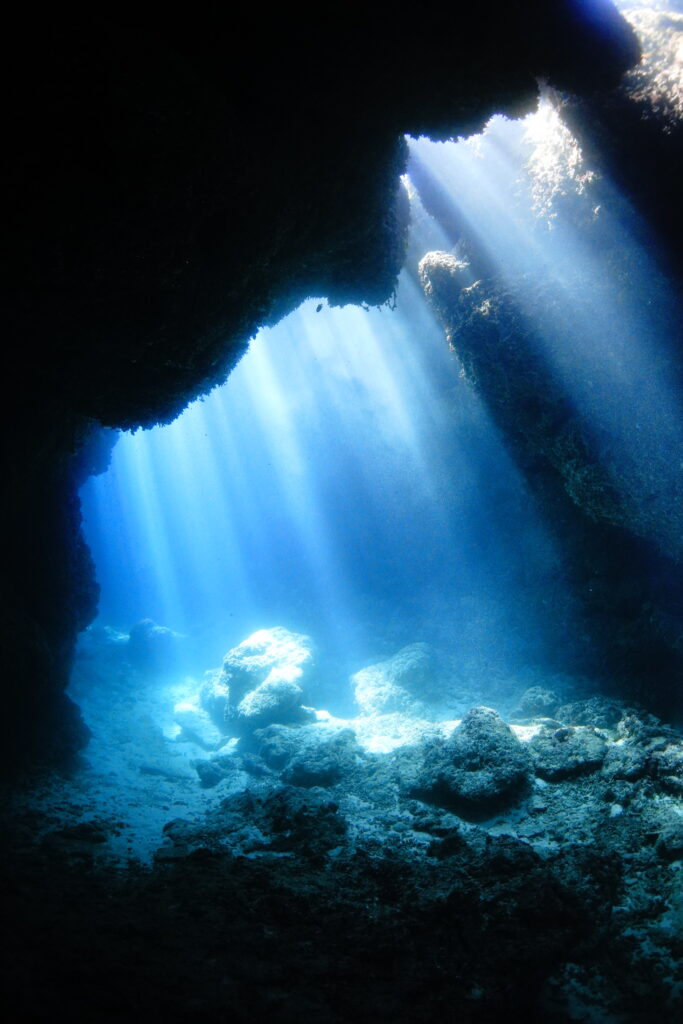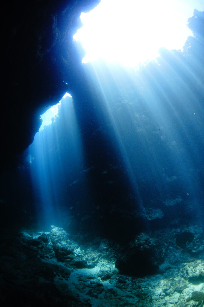 洞窟の中にはしっかりと光が差し込み、幻想的な空間に。アオギハゼやヒレナガスズメダイ、ハナゴイなどを見ながら、最後は光の演出で締めくくる気持ちのいい1本となりました。