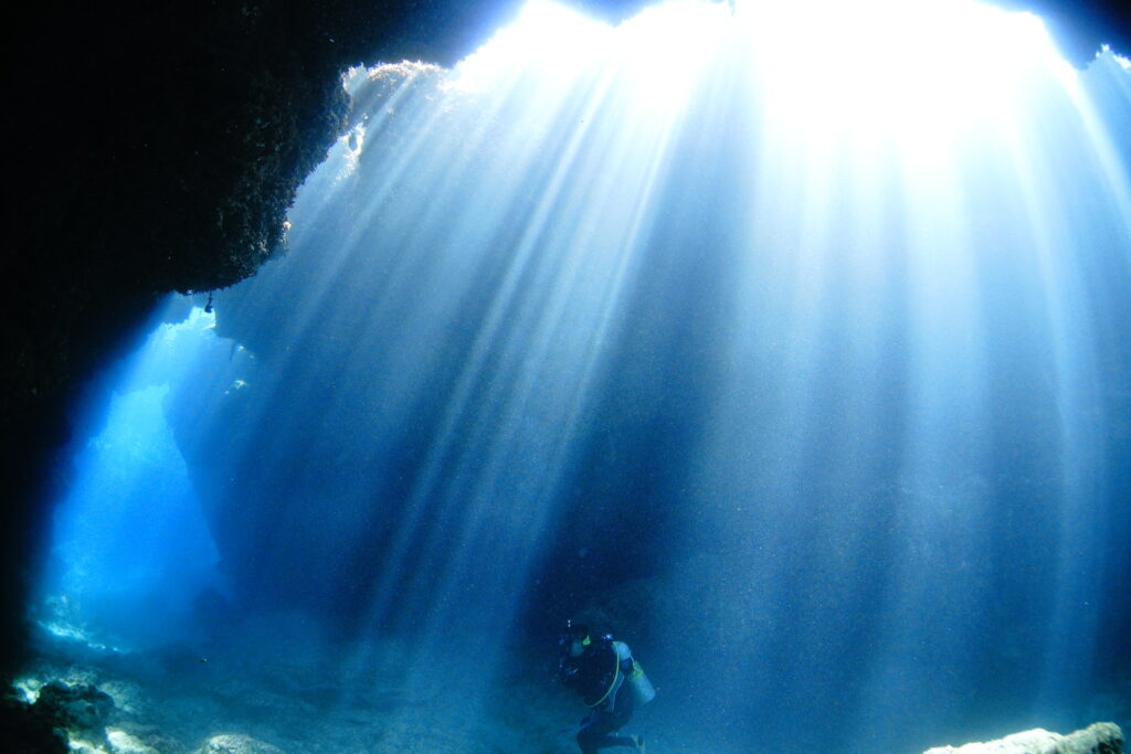 水温23℃、透明度20m。午前中は薄曇りで洞窟には少し厳しいコンディションでしたが、午後には雲がすっきり抜けてタイミングばっちり。