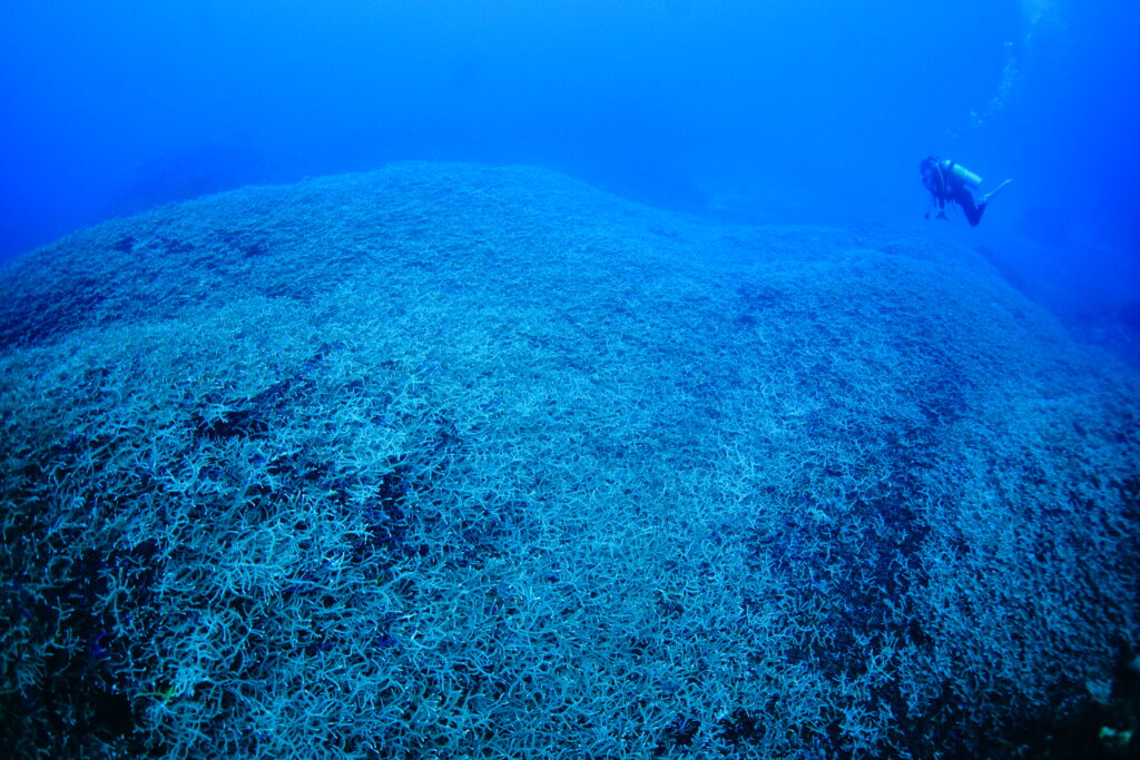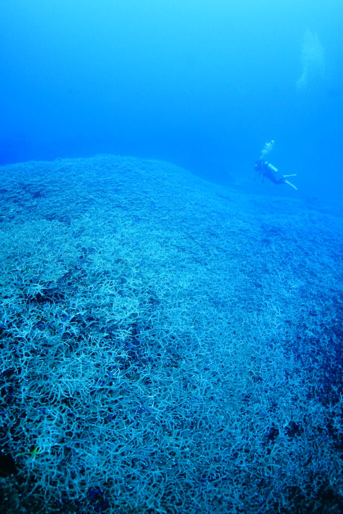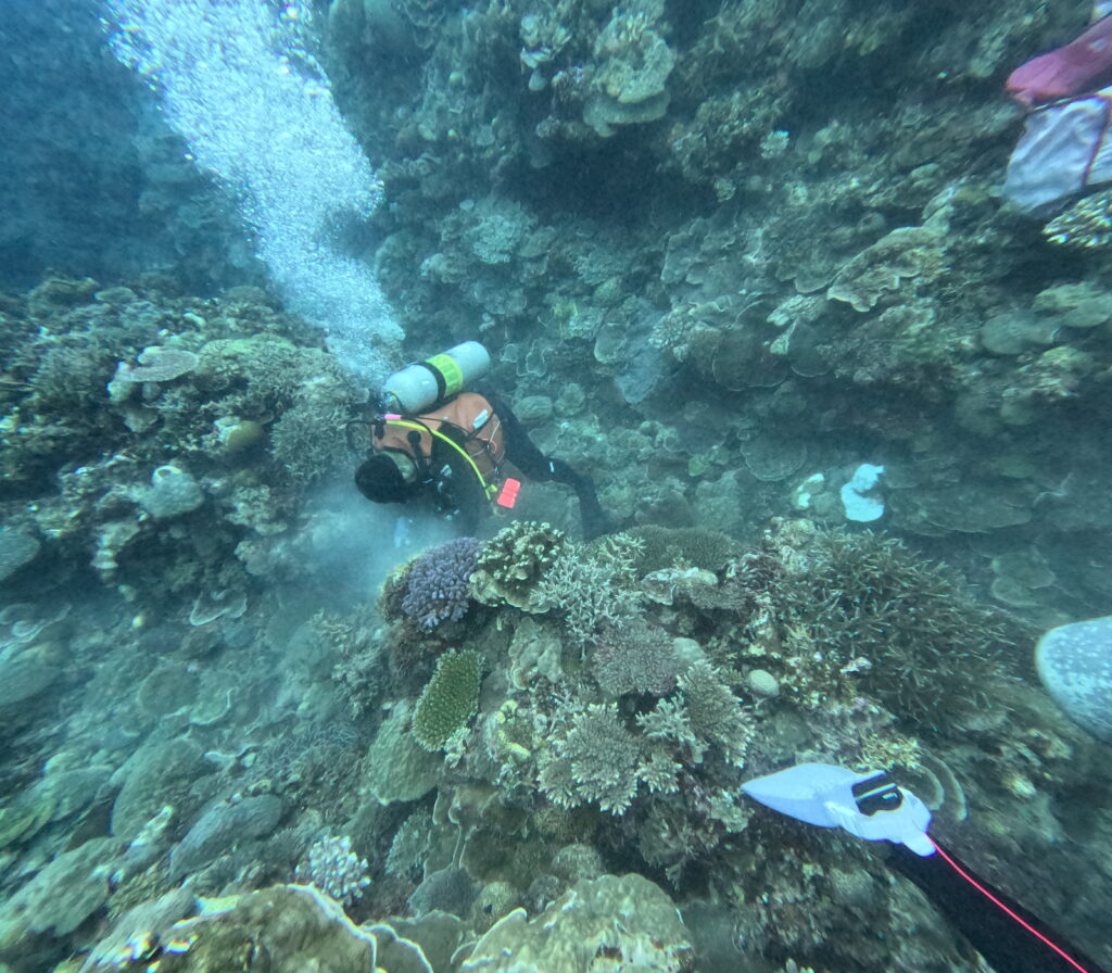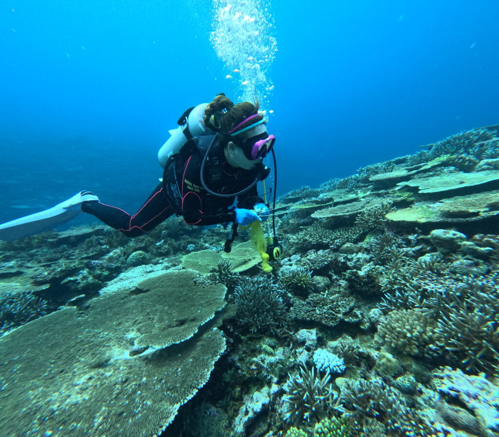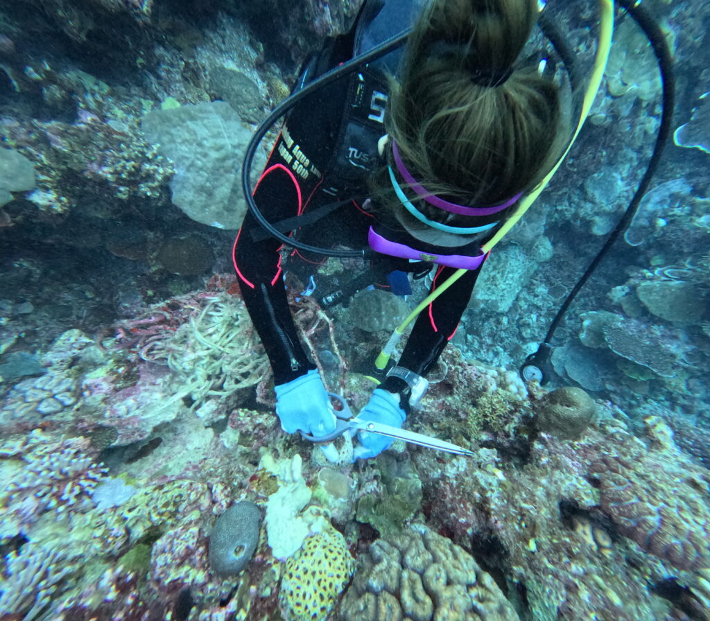 レイシガイによる食害で白くなってしまったサンゴの周りを探してピンセットで取っていく作業。