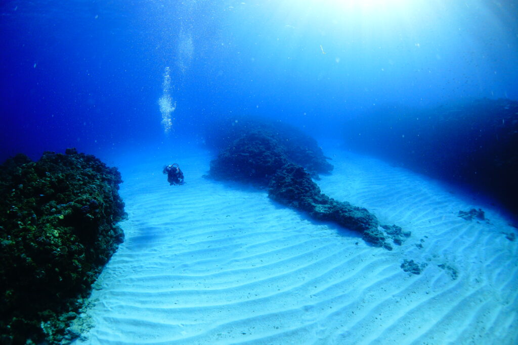伊是名島の海は、サンゴ礁、白い砂地、光が差し込む地形など、景色を楽しむダイビングが中心です。