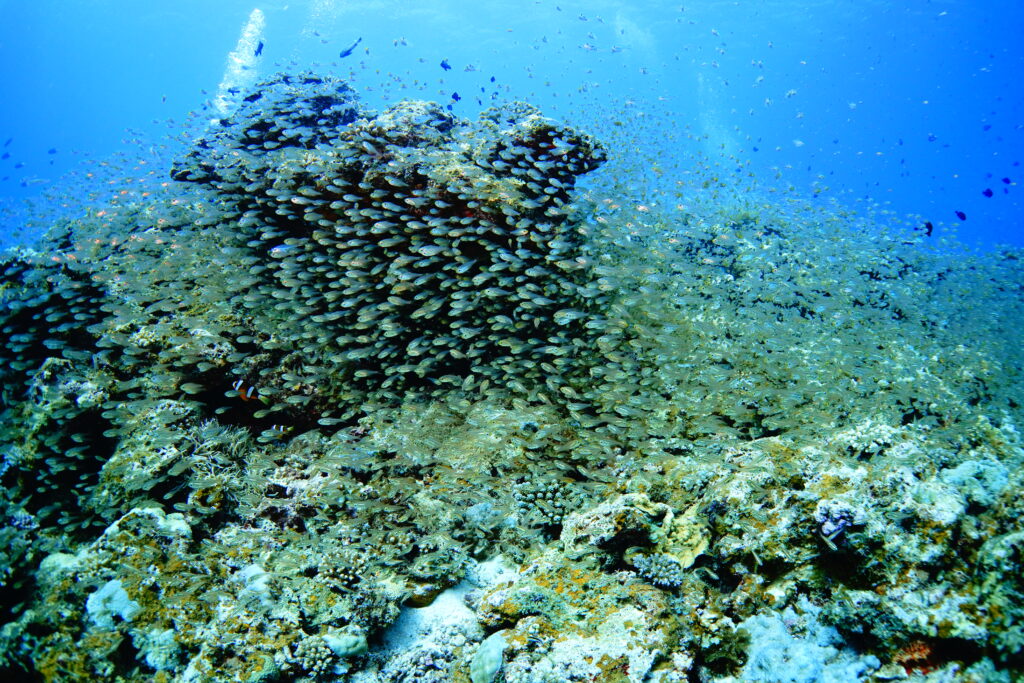 春の伊是名島の海では、小さな魚たちが生まれはじめ、幼魚の群れをあちこちで見ることができます。