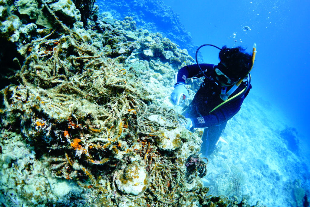 ・サンゴに絡まった廃漁網の回収